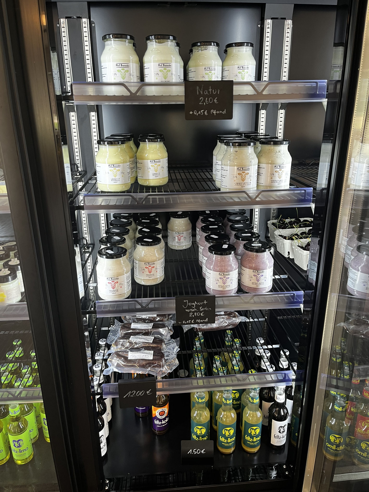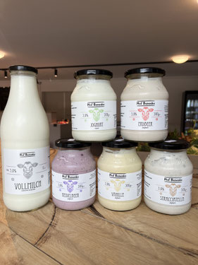 Aktuell bekommt ihr aus unserer hofeigenen Molkerei frische Milch und Joghurt – sowie Eiskaffee und Kakao, hergestellt mit unserer eigenen Milch.